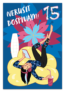 Vtipné blahopřání k 15. narozeninám. Přání je vevnitř zdobeno motivy z titulní strany. Nemá předepsaný text. Baleno v bílé obálce. Rozměr 19,5x13,5 cm.