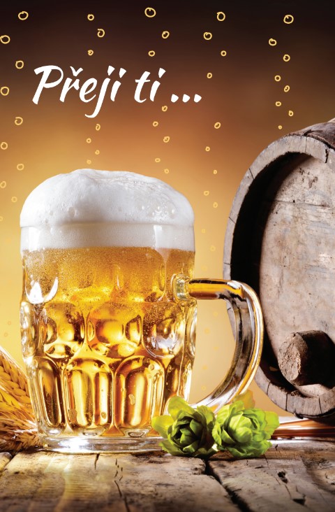 Originální blahopřání k narozeninám s textem na titulce Přeji ti... Titulní strana zdobena zlatým potiskem. Přání je vevnitř zdobeno motivem z titulní strany a textem: ….aby tvůj život byl vždy stejně osvěžující jako pvní doušek piva!Baleno v sáčku, součástí je bílá obálka. Rozměr 17x11,5cm.