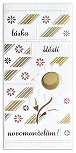 Blahopřání novomanželům ve zlatobílé barvě s bílou obálkou. Uvnitř nemá předepsaný text. Rozměr 21x10cm.