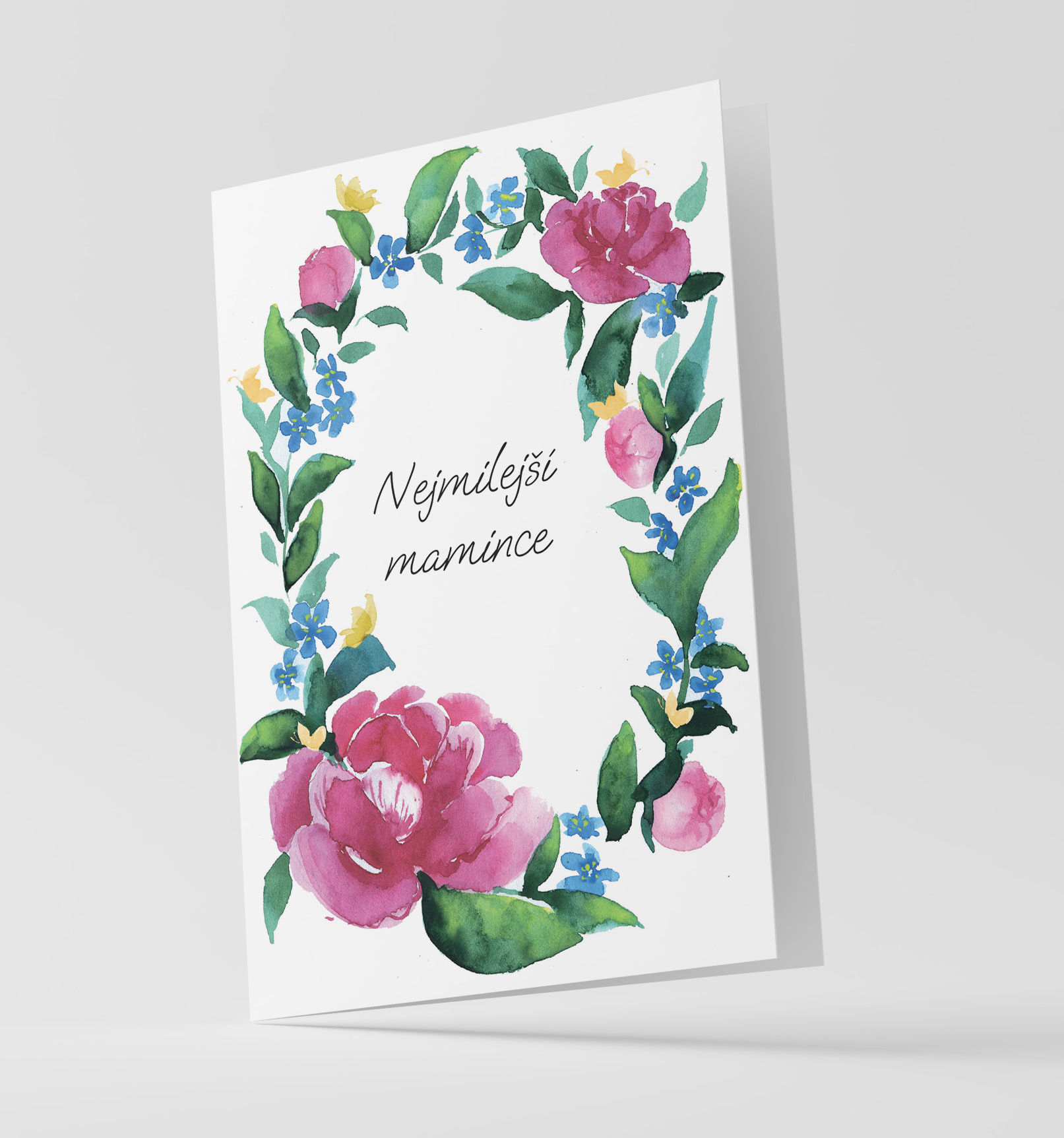 Blahopřání k svátku matek, narozeninám, nebo jmeninám Nejmilejší mamince s malovanými květy a bílou obálkou.