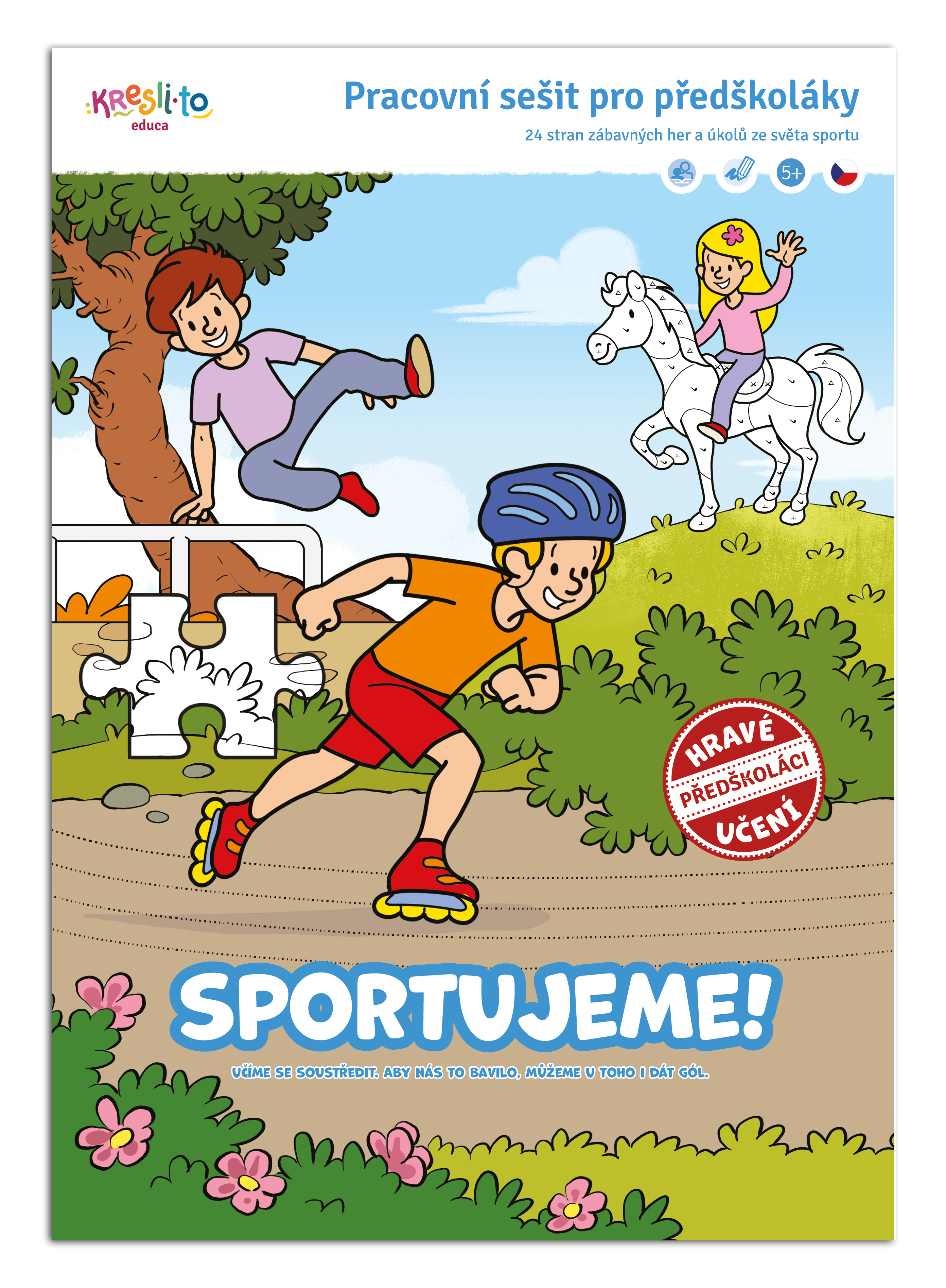 24 zábavných aktivit – spojování čísel, vybarvování podle symbolů, bludiště, puzzle, grafomotorika, počítání, hledání rozdílů to vše ve světě oblíbených sportů.